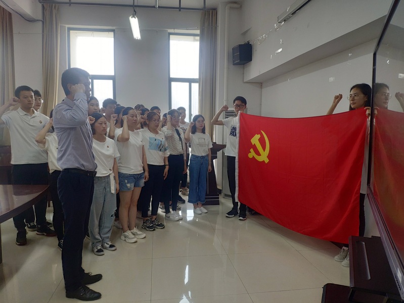 活动在庄严的《国际歌》中拉开序幕,22名新发展的本科生预备党员佩戴党员徽章,在学院党委副书记张志刚的带领下,面向鲜红的党旗庄严宣誓,表达了对党的忠诚、为共产主义事业奋斗终生的坚定决心。