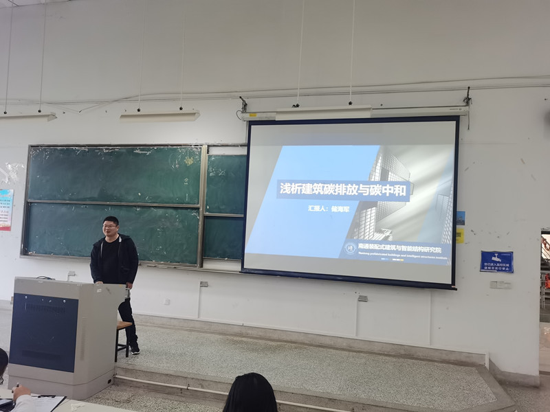 储海军首先向学生介绍了“碳达峰”与“碳中和”的源起,建筑碳排放概念以及现状。随后,他以实际工程为例,进一步阐述了如何在建筑生产活动中实践碳中和。最后储海军对常见的“碳名词”,例如碳交易、碳汇、碳足迹、碳标签等做了解析。报告会上,储海军还就学生关心的问题进行了解答。