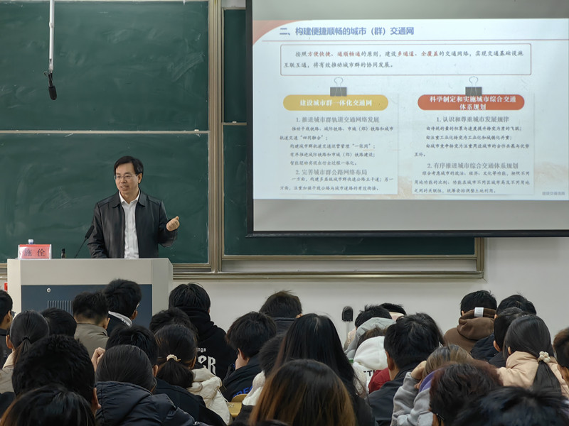12月13日下午,校党委常委、副校长施佺以“加快建设交通强国,当好中国式现代化开路先锋”为题,为yl23455永利集团24级交通设备与控制工程专业本科生讲授形势与政策课。